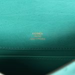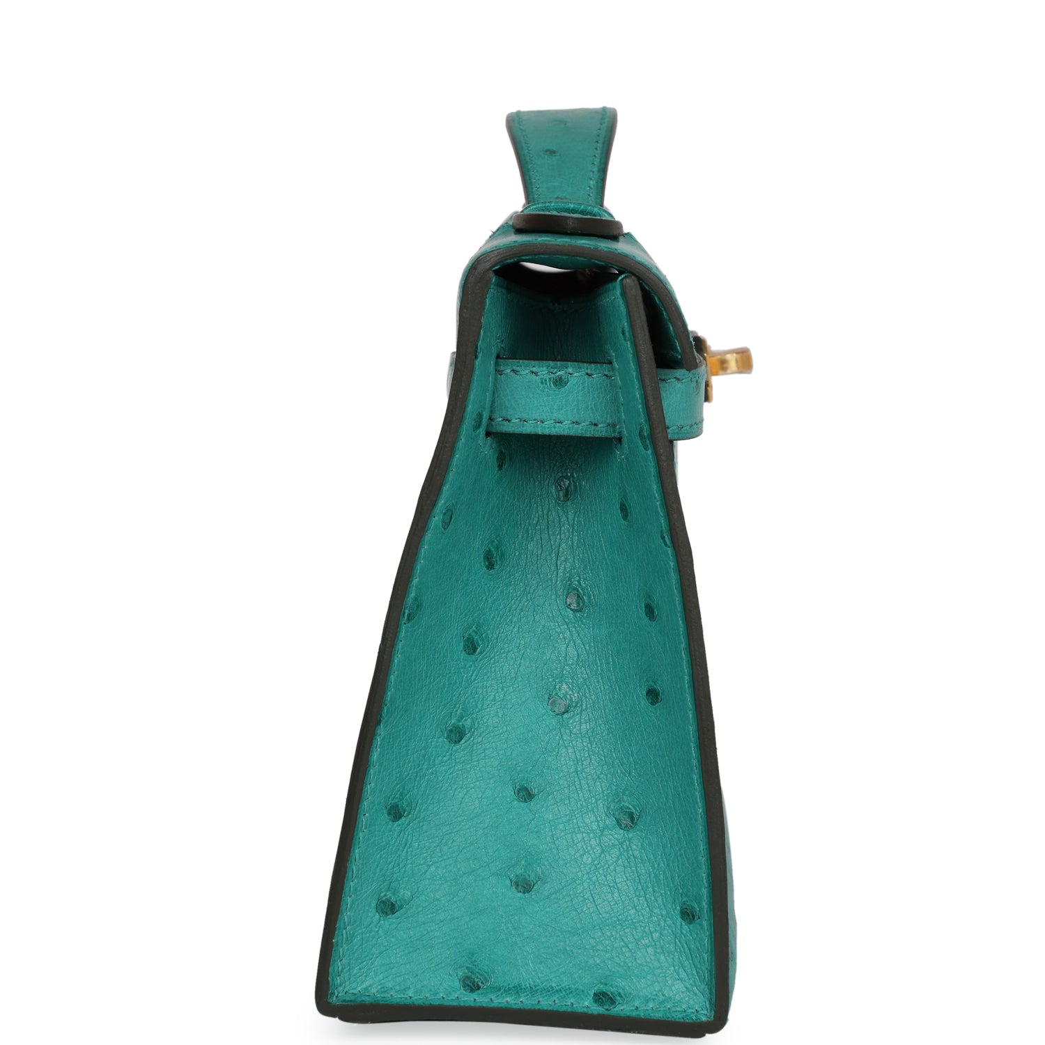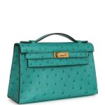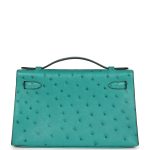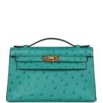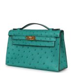 This Mini Kelly Pochette is inVert Verone ostrich withgold hardware and has tonalstitching, front flap, two straps withcenter toggle closure and a top flat handle.