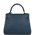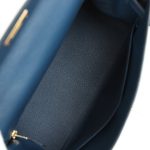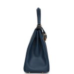 This Kelly, in the Retournestyle, is in Deep Bleu evercolor leather with gold hardware and has tonalstitching, front flap, two straps with center toggle closure, clochette with lock and two keys, single rolled handle and removable shoulder strap.