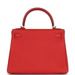 This Kelly, in the Retourne style, is in Geranium togo leather with gold hardware and has tonal stitching, front flap, two straps with center toggle closure, clochette with lock and two keys, single rolled handle and removable shoulder strap.