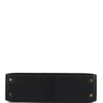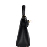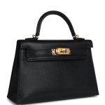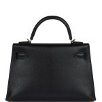 This Kelly, in the Sellier style, is in Black Chevre Mysore leather with gold hardware, has tonal stitching, two straps with front toggle closure, a single rolled handle, and a removable shoulder strap.