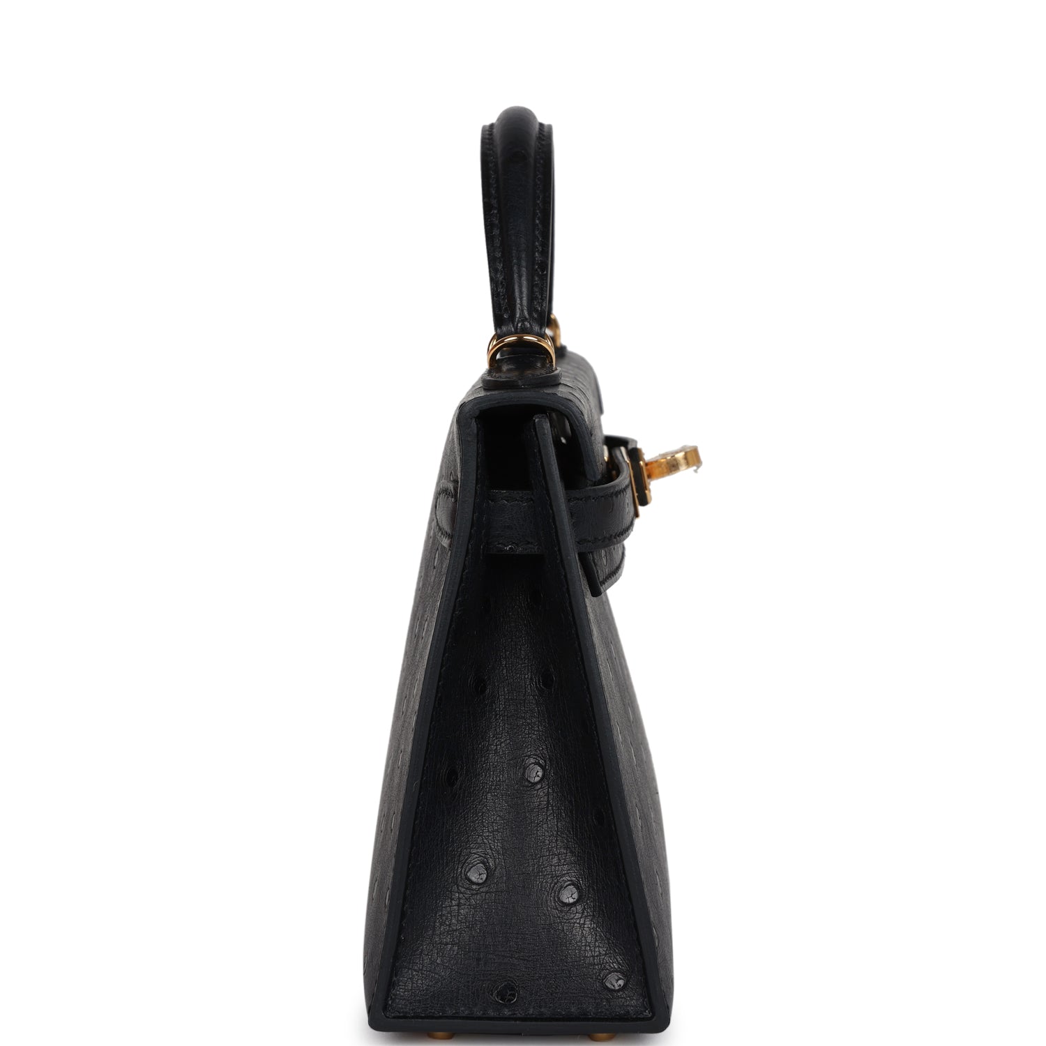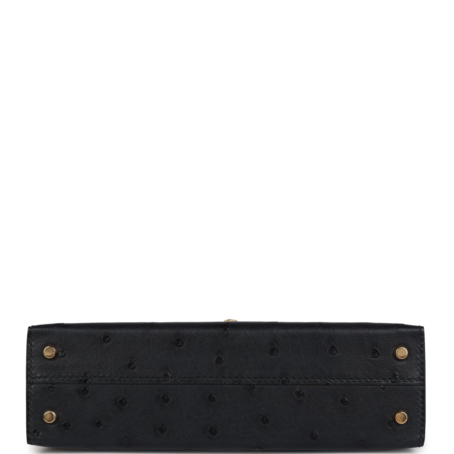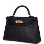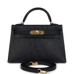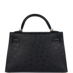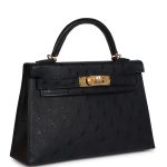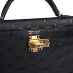 This Kelly, in the Sellier style, is in Black ostrich leather with gold hardware andhas tonal stitching, two front straps with front toggle closure, single rolled handle and removable shoulder strap.