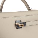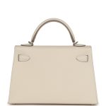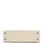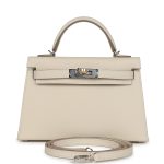 This Kelly, in the Sellier style, is in Craie epsom leather with Electrum hardware andhas tonal stitching, two straps with front toggle closure, single rolled handle and removable shoulder strap.