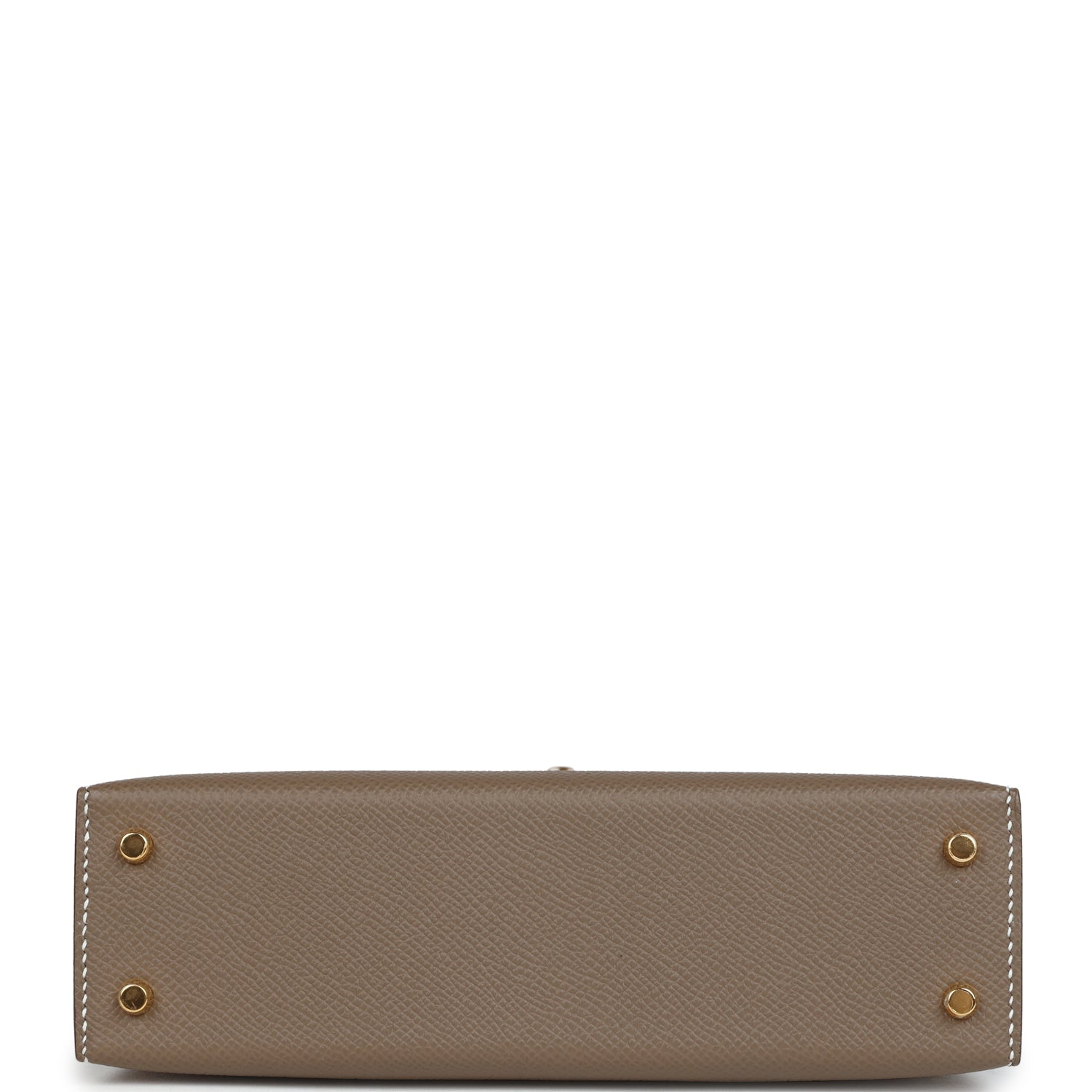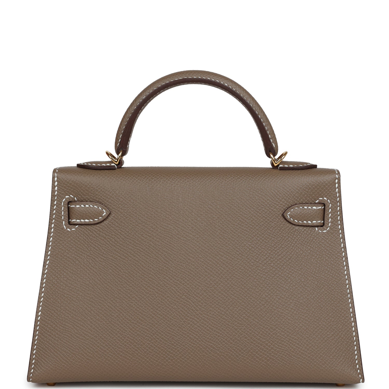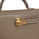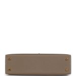 This Kelly, in the Sellier style, is inEtoupe epsom leather with gold hardware andhascontrast stitching, two straps with front toggle closure, single rolled handle and removable shoulder strap.