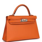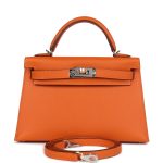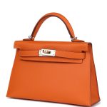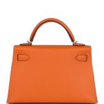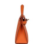 This Kelly, in the Sellier style, is inOrange epsom leather with electrum hardware and has tonal stitching, two straps with front toggle closure, single rolled handle and removable shoulder strap.
