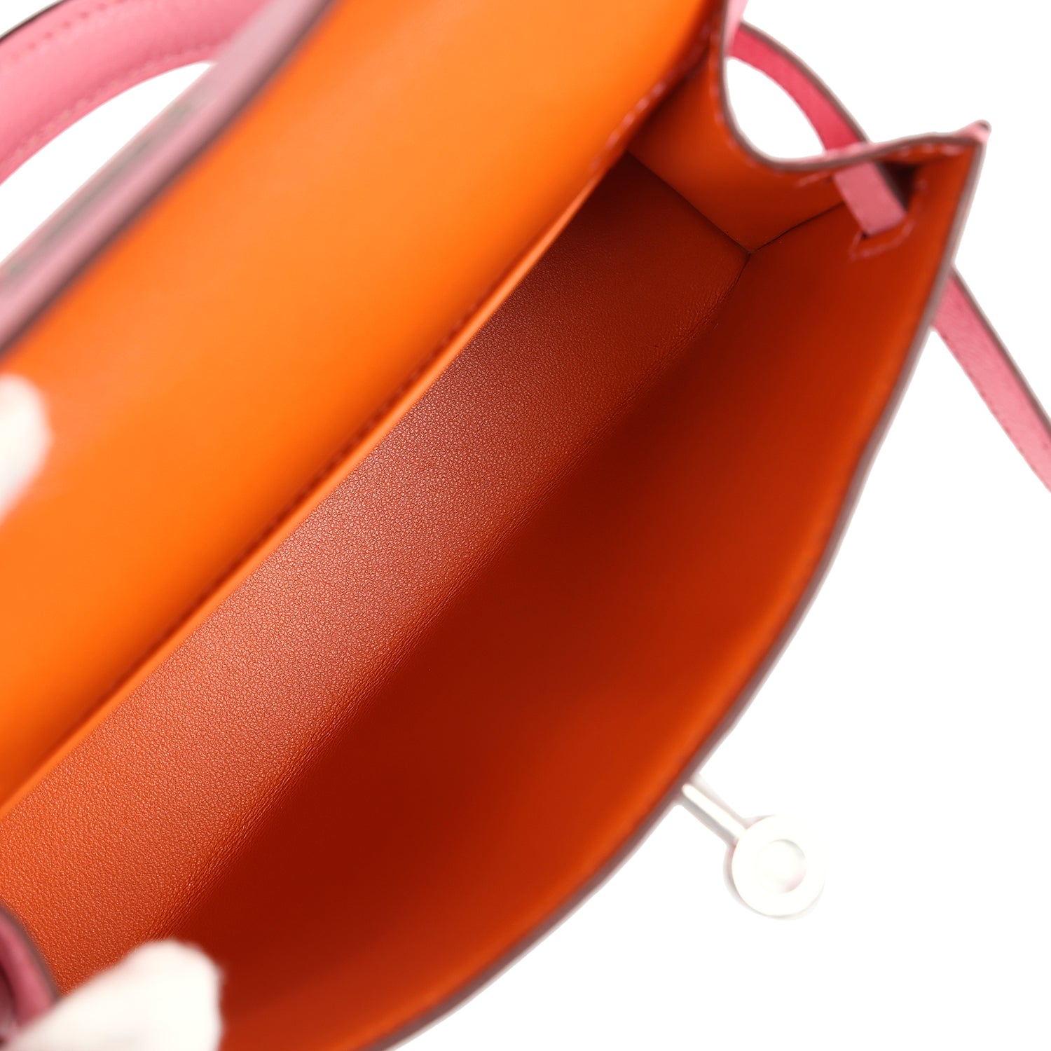 The interior is lined with Orange lambskin leather and has one open pocket on the back wall.
