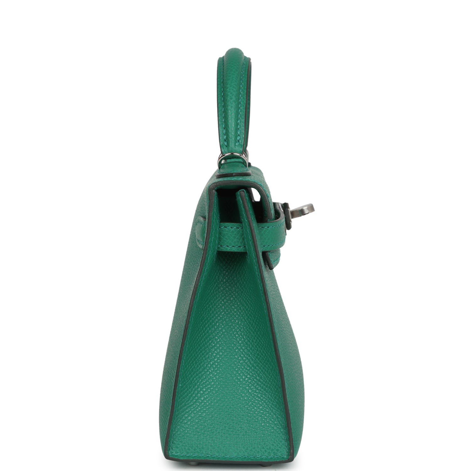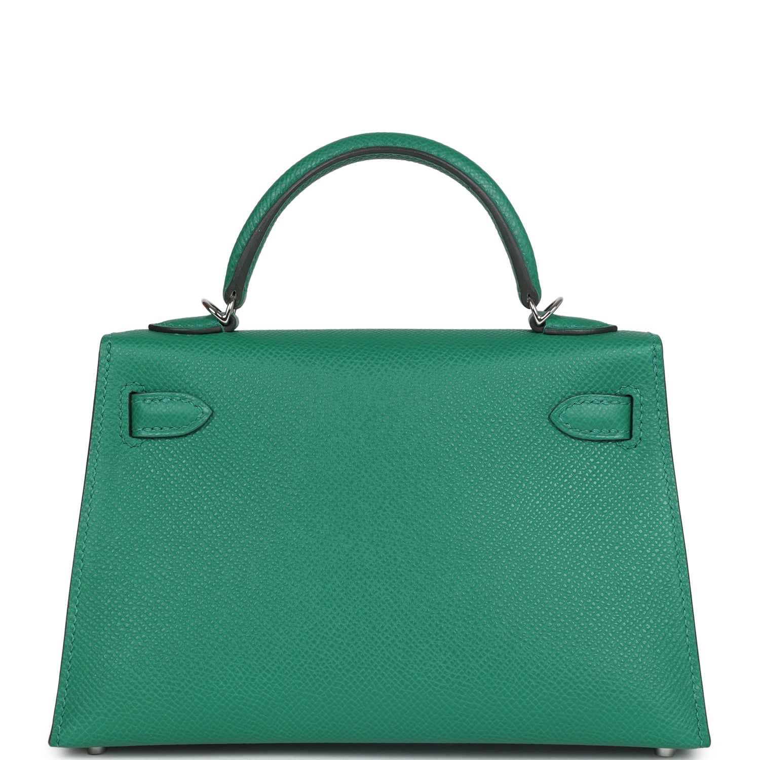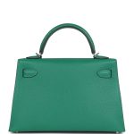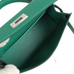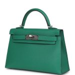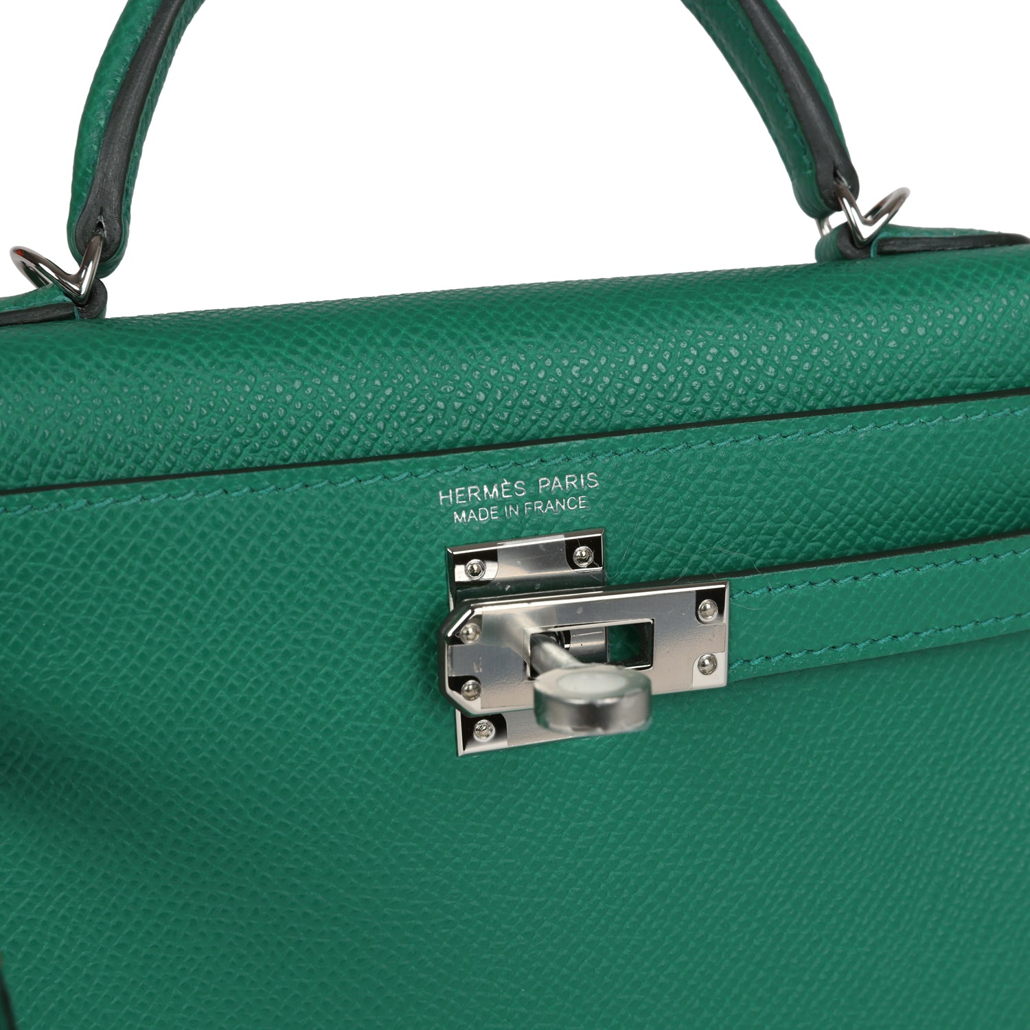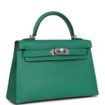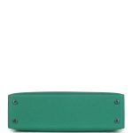 This Kelly, in the Sellier style, is in Vert Vertigo epsom leather with palladium hardware,hastonal stitching, two front straps with front toggle closure, single rolled handle and removable shoulder strap.