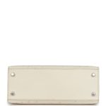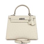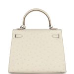 This Kelly, in the Sellier style, is in Beton ostrich with palladium hardware and has tonal stitching, two straps with front toggle closure, clochette with lock and two keys, single rolled handle and removable shoulder strap.