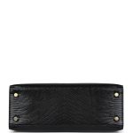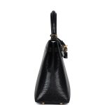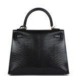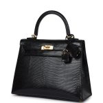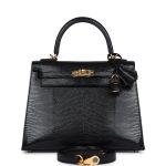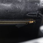 This Kelly, in the Sellier style, is of Black Shiny Varanus Niloticus Lizard with gold hardware and has tonal stitching, front flap, two straps with center toggle closure, clochette with lock and two keys, single rolled handle and a removable strap.