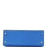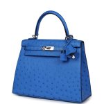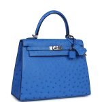 This Kelly, in the Sellier style, is inBleuetostrich with palladium hardware and has tonal stitching, two straps with front toggle closure, clochette with lock and two keys, single rolled handle and removable shoulder strap.