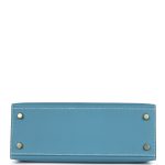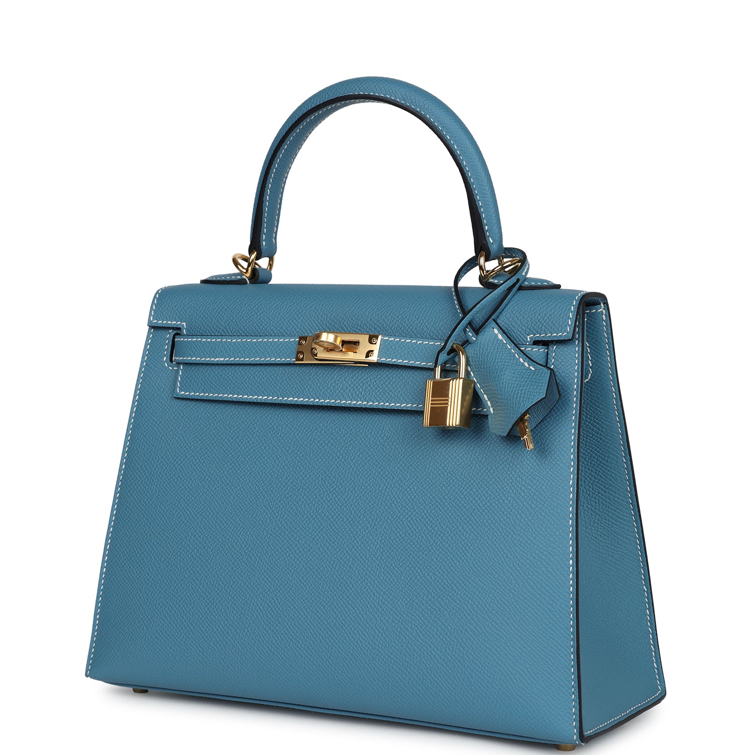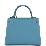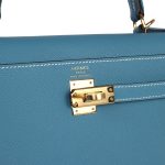This Kelly, in the Sellier style, is in New Blue Jean epsom leather with gold hardware and has contraststitching, front flap, two straps withcenter toggle closure, clochette with lock and two keys a single rolled handle and removable shoulder strap.