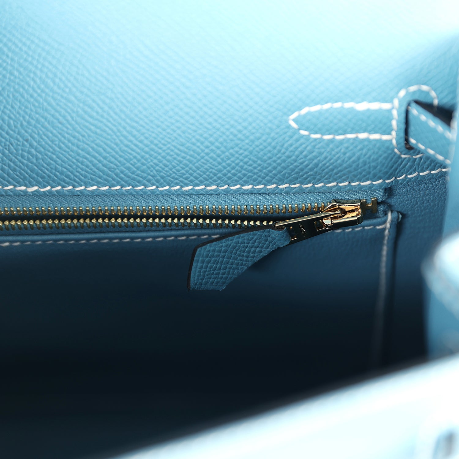 The interior is lined withNew Blue Jeanchevre leather and has one zip pocket with an Hermès engraved pull and one open pocket on the opposite side.