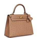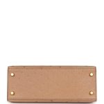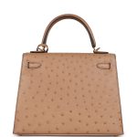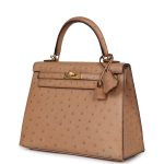 This Kelly, in the Sellier style, is inChai Ostrich withgold hardware and has tonal stitching, two straps with front toggle closure, clochette with lock and two keys, single rolled handle and removable shoulder strap.