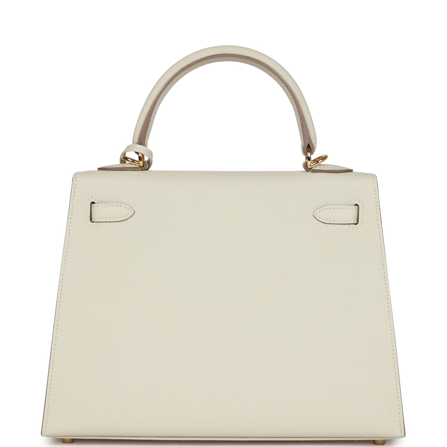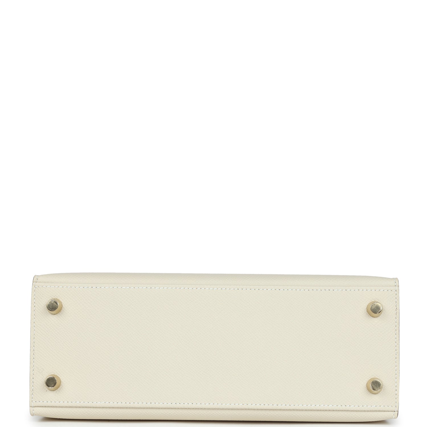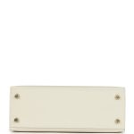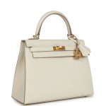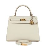 This Kelly,in the Sellier style, is in Craie epsom leather with Gold hardware andhastonal stitching, front flap, two straps with center toggle closure,clochette with lock and two keys, single rolled handle and removable shoulder strap.