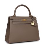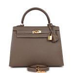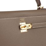 This Kelly, in the Sellierstyle, is in Etoupe epsom leather with gold hardware, hascontrast stitching, front flap, two straps withcenter toggle closure, clochette with lock and two keys a single rolled handle and removable shoulder strap.