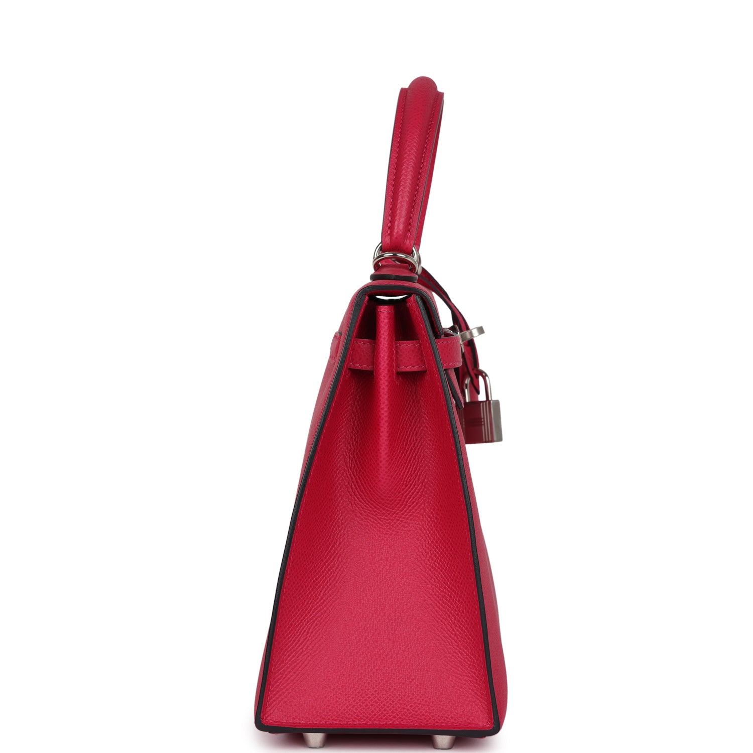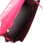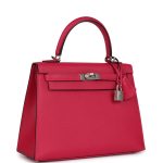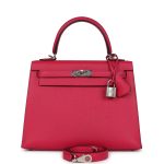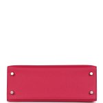 This Verso Kelly, in the Sellier style, is in Framboise epsom leather with palladium hardware, has tonal stitching, front flap, two straps with center toggle closure, clochette with lock and two keys a single rolled handle and removable shoulder strap.