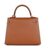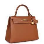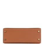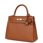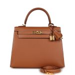 This Kelly is in GoldMadame leather with gold hardware, has contrast stitching, front flap, two straps with center toggle closure, clochette with lock and two keys, single rolled handle and an optional shoulder strap.