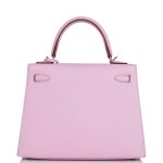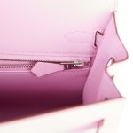 This Kelly, in the Sellier style, is inMauve Sylvestre epsom leather withpalladium hardware andhastonal stitching, two front straps with toggle closure, clochette with lock and two keys, single rolled handle and removable shoulder strap.