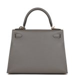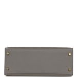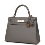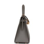 This Kelly, in the Sellierstyle, is inGris Meyer epsom leather withgold hardware and hastonalstitching, front flap, two straps with center toggle closure, clochette with lock and two keys a single rolled handle and removable shoulder strap.