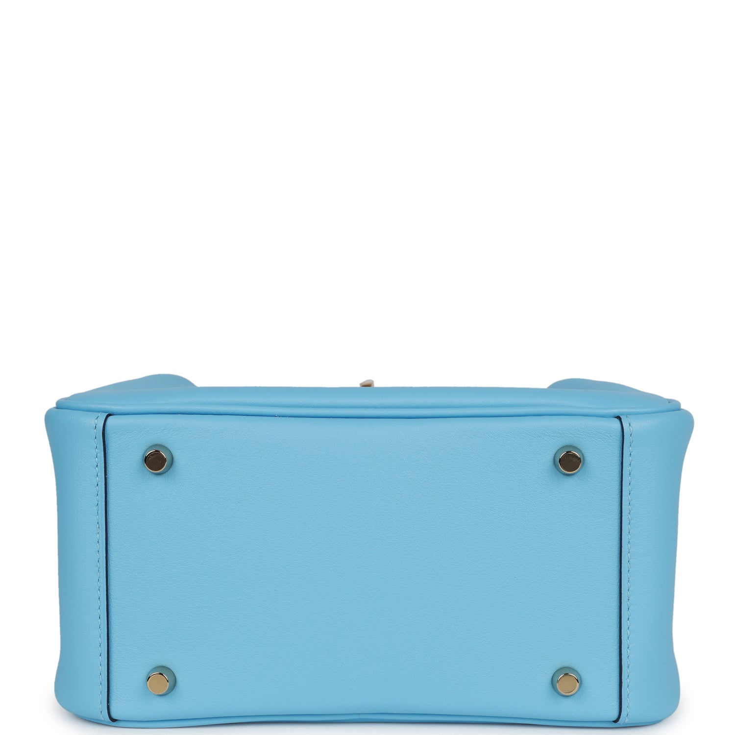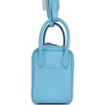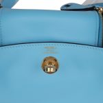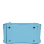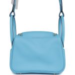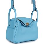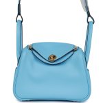 This Mini Lindy is inCeleste swift leather withgold hardware and has tonal stitching, double zipper pulls, front Hermès twist lock, single pocket on each side, two rolled top handles linked by a flat shoulder strap.