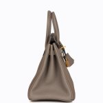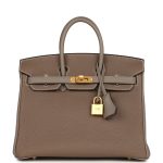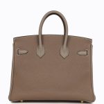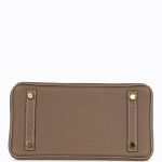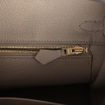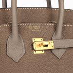 This Birkin is inEtoupe andEtain togo leather with brushed gold hardware and hascontrast and tonal stitching,front flap, two straps withcentertoggle closure, clochette with lock and two keys, and double rolled handles.