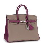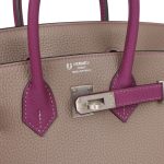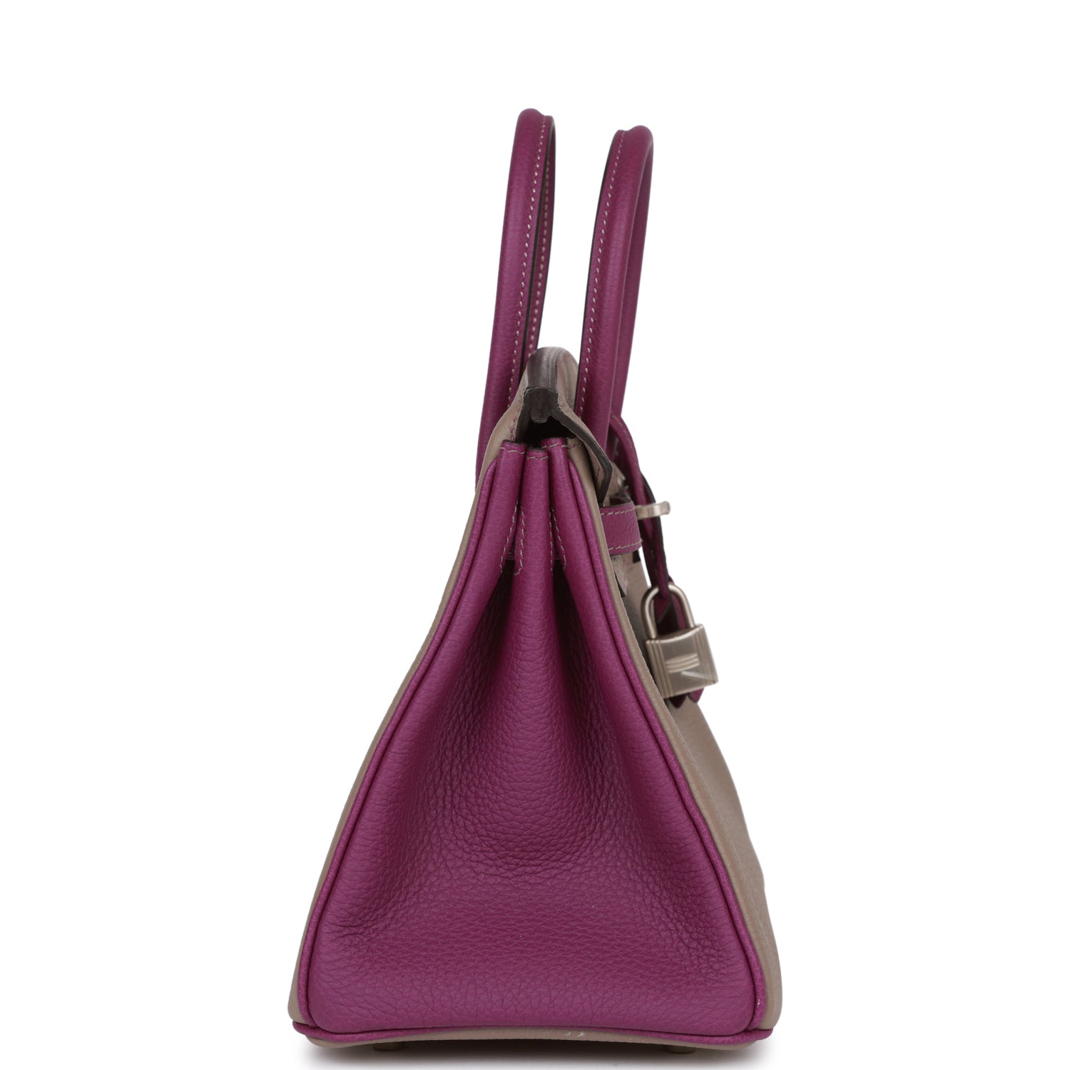 ThisSpecial OrderBirkin is inGris Asphalte and Anenome togo with brushed palladium hardwareand hascontrast stitching,front flap, two straps withcentertoggle closure, clochette with lock and two keys, and double rolled handles.