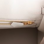 The interior is lined with Gris Perle chevre and has one zip pocket with an Hermès engraved zipper pull and an open pocket on the opposite side.