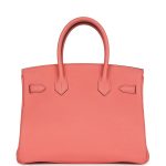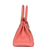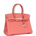 This Special Order Birkin is inRose Candytogoleather with goldhardware and hastonal stitching,front flap, two straps withcentertoggle closure, clochette with lock and two keys, and double rolled handles.
