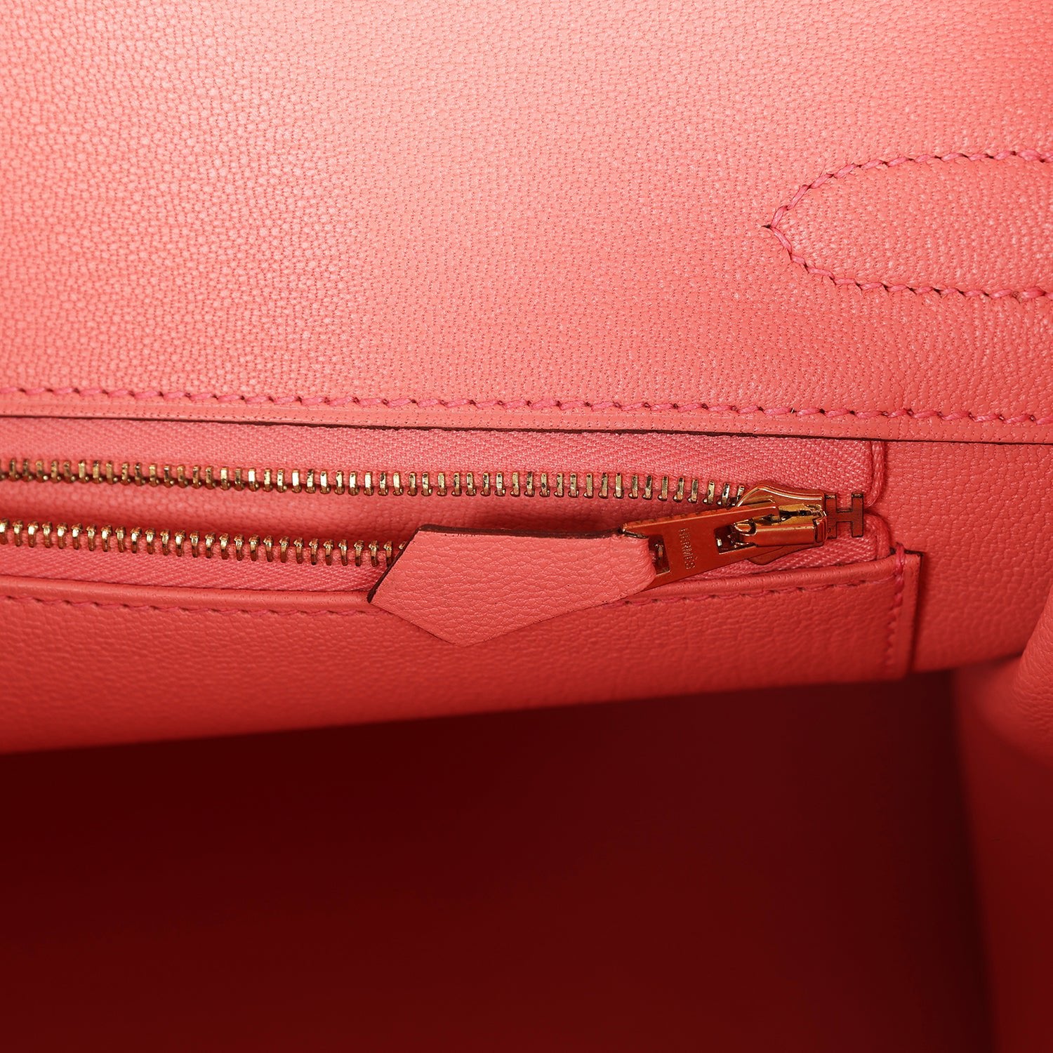 The interior is lined with Rose Candy chevre and has one zip pocket with an Hermès engraved zipper pull and an open pocket on the opposite side.