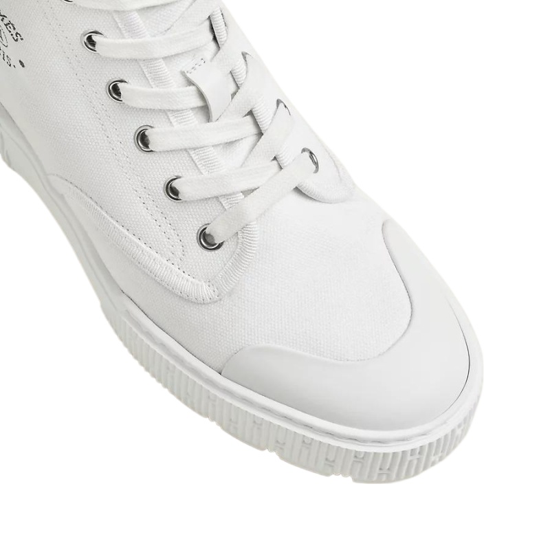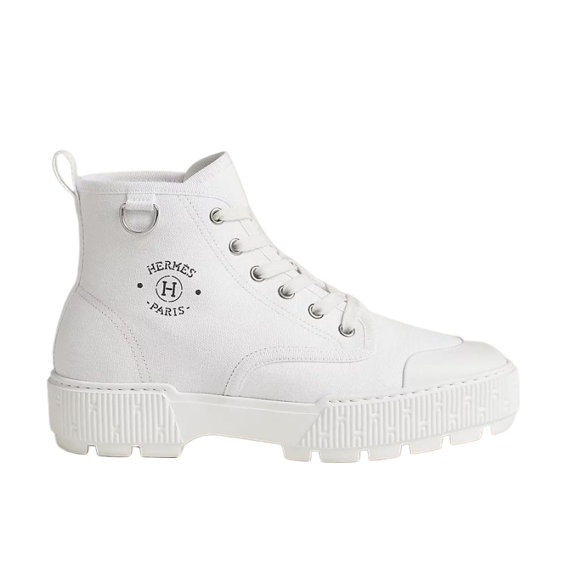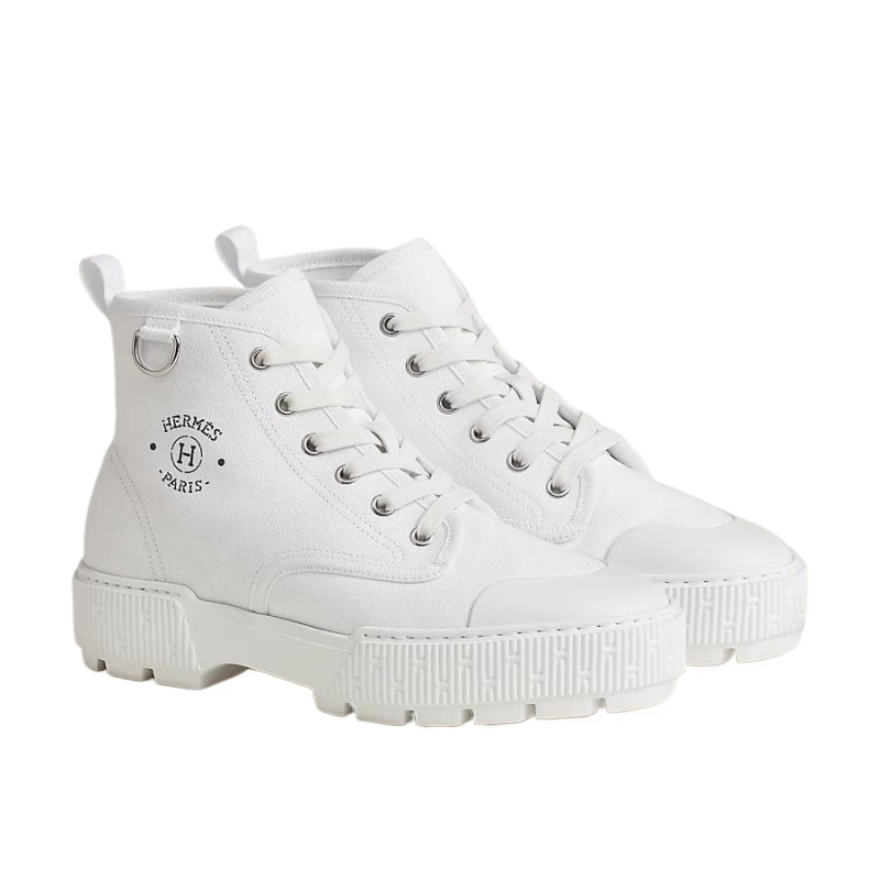 Ankle boot in cotton canvas and calfskin with rubber sole and signature ‘Hermes Paris’ stencil.