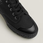Ankle boot in cotton canvas and calfskin with rubber sole and signature ‘Hermes Paris’ stencil.