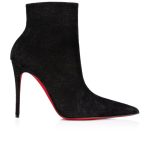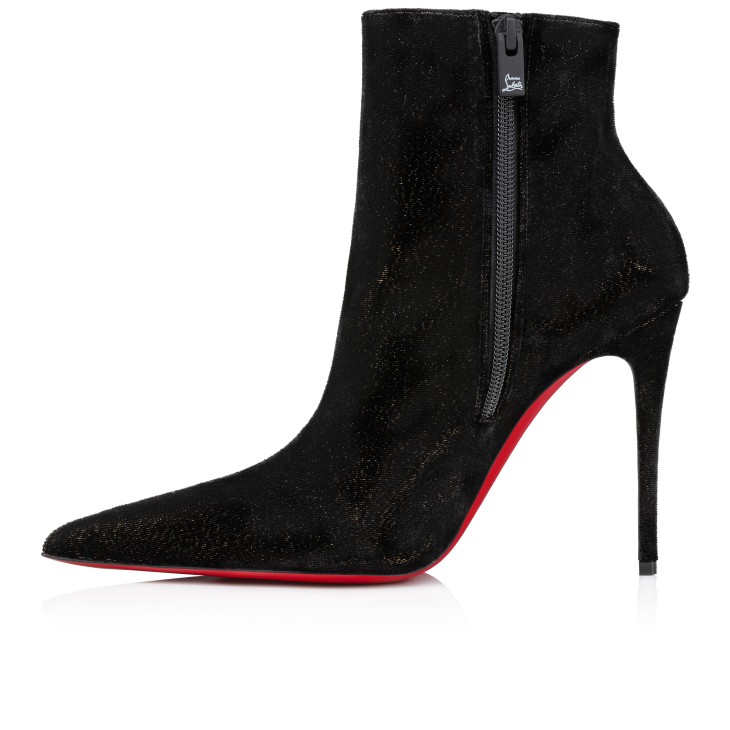 The Kate Max Booty features elegant lines and characterises Maison Christian Louboutin’s ‘savoir-faire’. An urban boot with a very pointed toe and a side zip. Crafted entirely in black-gold velour, this sophisticated pump sits on a 100 mm heel.?This model features a new ‘Everlasting Red Sole’ thanks to an innovative coating technique that ensures resistance and lasting vibrancy for our signature Louboutin red.