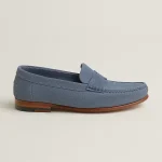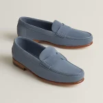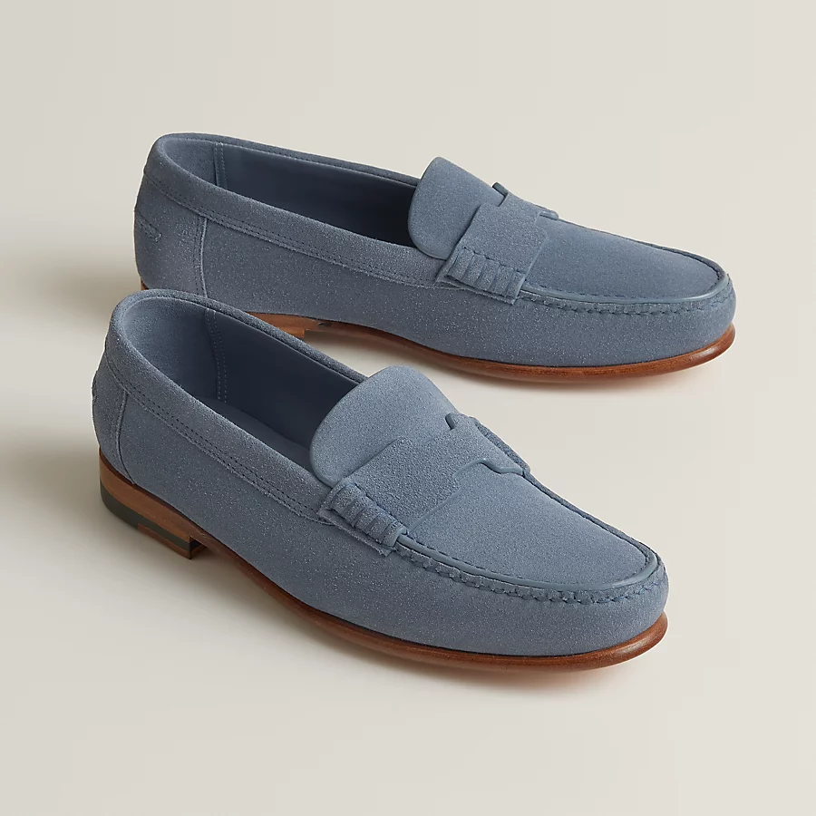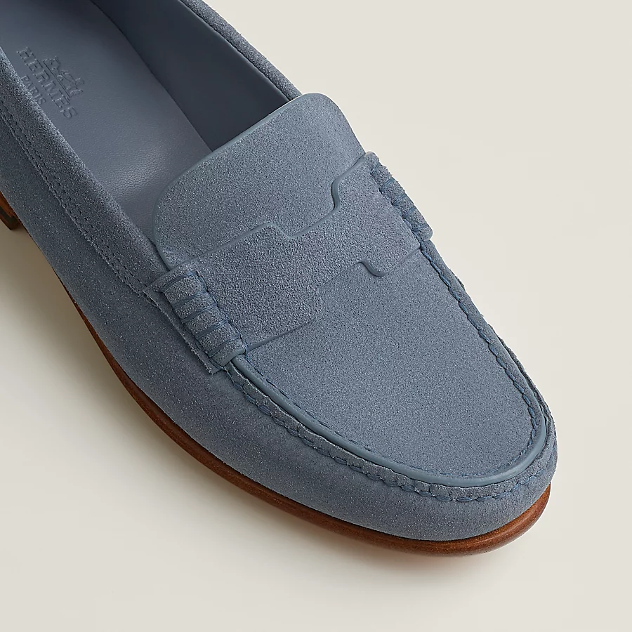 Loafer in suede calfskin with hand-stitched apron.
