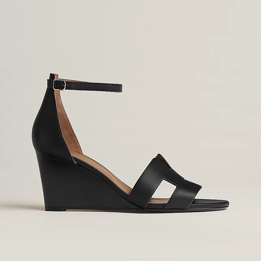 Sandal in calfskin with iconic ‘H’ cut-out, wedge heel, and thin ankle strap.