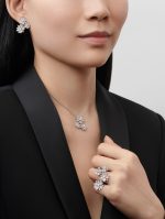 Lotus pendant, 3 flowers, rhodium plated 18K white gold, round diamonds; diamond quality DEF, IF to VVS.The pendant is attached to the necklace’s chain