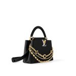 Part of the Trilogy line, this Capucines BB is the epitome of sophistication with its triple chain adornment. Look closely to notice the jewel-like chain details, including signature mini padlocks and enameled Monogram flowers. This double-carry style is crafted from iconic Taurillon leather and is accented with gold-toned hardware. It is fitted with multiple interior pockets and can be worn several ways.