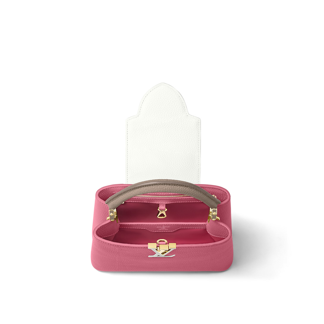 A striking trio of colors on full-grain Taurillon leather and a braided chain strap bring a bold feel to this Capcuines BB handbag. The bag’s structured lines perfectly complement the curve of its single top handle. The versatile Capucines can be carried with the flap outside or tucked into the bag.