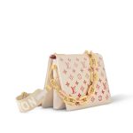 This Coussin PM handbag is made from Monogram Empreinte leather, with a Monogram print that seems to have been painted on the leather in watercolor. The touches of orange, pink and fuchsia bring an optimistic feel to the bag. There’s a removable chain with colorful plexiglass links and a removable strap for shoulder or cross-body carry.