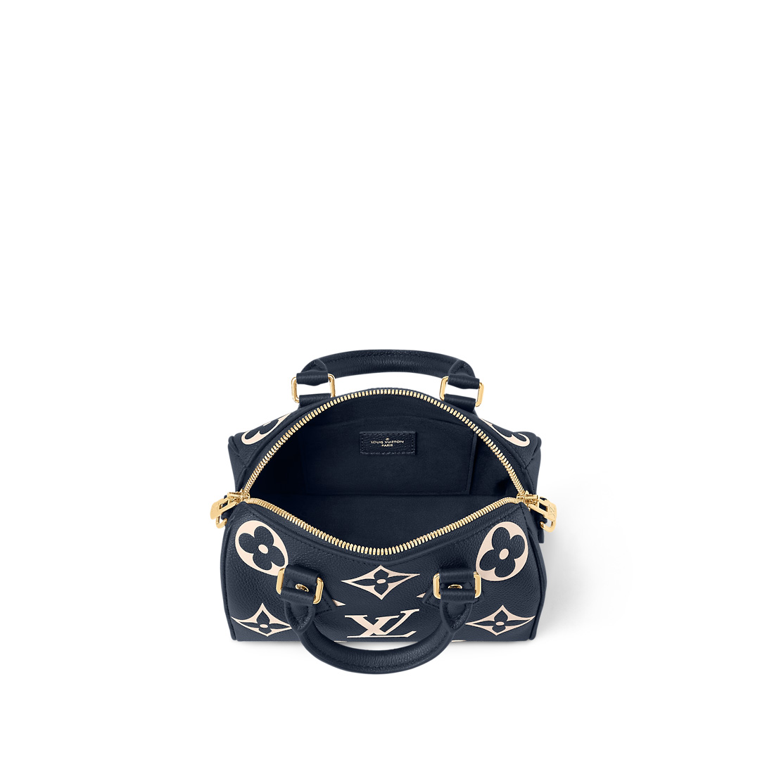 Two-color Monogram Empreinte cowhide leather brings a luxurious aspect to the Speedy Bandoulière 20. The Monogram is first embossed into the navy-blue leather, then the pattern is printed in cream on top of the embossing. Part of the Nautical Collection, the Speedy features two top handles and a removable and adjustable strap for shoulder carry.