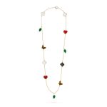 Lucky Alhambra long necklace, 12 motifs, 18K yellow gold, carnelian, tiger’s eye, white and gray mother-of-pearl, malachite.