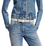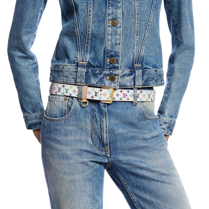 The LV x TM LV D-ring belt enhances a variety of silhouettes with its trendy allure. This accessory belongs to Louis Vuitton??s collaboration with influential Japanese artist Takashi Murakami, whose Monogram Multicolor offers a vibrant take on the House’s heritage pattern. Offered in white multicolor canvas, the belt is finished with a golden ardillon buckle and a D-ring for keys or charms.
