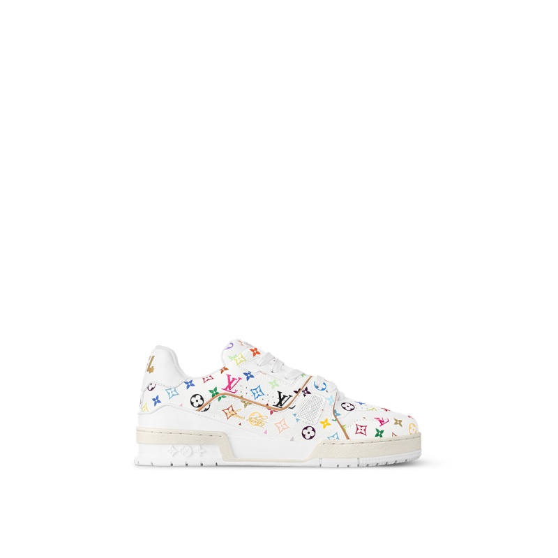 The iconic LV Trainer sneaker makes a fresh statement in grained calf leather featuring an allover print of a multicolored Monogram motif from the re-edition of the Louis Vuitton x Murakami collection, inspired by the artist??s exuberant aesthetic. Informed by vintage sporty styles, the upper is detailed with a cursive Louis Vuitton signature, while the back is printed with the number 54 in reference to 1854, the year the House was founded.