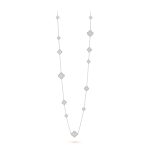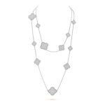 Magic Alhambra long necklace, 16 motifs, rhodium plated 18K white gold, round diamonds; diamond quality DEF, IF to VVS.