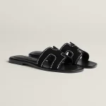 Sandal in calfskin with iconic ‘H’ cut-out and rhinestone details.