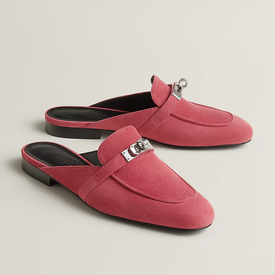 Mule in suede goatskin with iconic palladium-plated Kelly buckle.