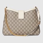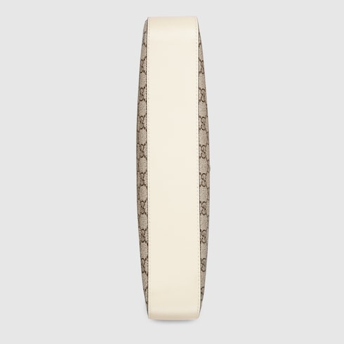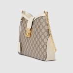 Drawing from the House’s origins as an artisanal luggage atelier, the Padlock closure features prominently on this shoulder bag in GG Supreme canvas. It is complete with gold-toned hardware, smooth white leather trim, a chain and leather shoulder strap.