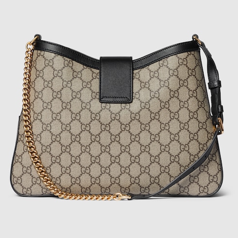 Drawing from the House’s origins as an artisanal luggage atelier, the Padlock closure features prominently on this shoulder bag in GG Supreme canvas. It is complete with gold-toned hardware, smooth black leather trim, a chain and leather shoulder strap.