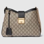 Drawing from the House’s origins as an artisanal luggage atelier, the Padlock closure features prominently on this shoulder bag in GG Supreme canvas. It is complete with gold-toned hardware, smooth black leather trim, a chain and leather shoulder strap.