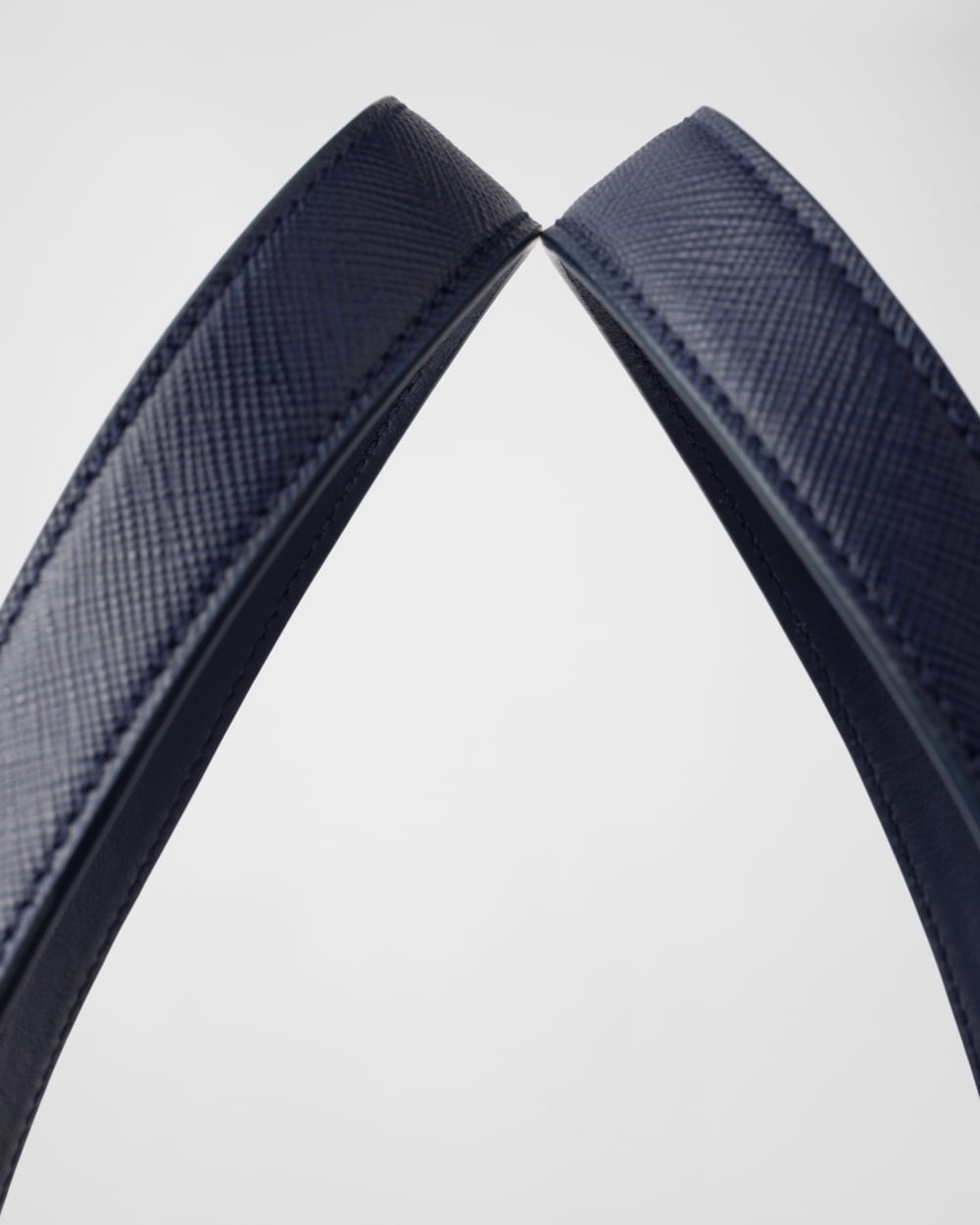 This tote bag with timeless charm, a re-edition of an archive design, sums up Prada codes in a sophisticated and pragmatic silhouette. The style with clean lines is made of Re-Nylon, an innovative regenerated nylon fabric that is the sustainable evolution of a distinctive material of the brand. Elegant Saffiano leather details complete the roomy accessory decorated with the iconic signature touch of the enameled metal triangle logo.