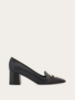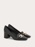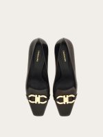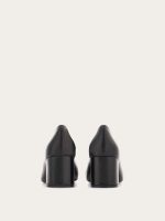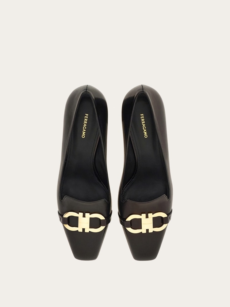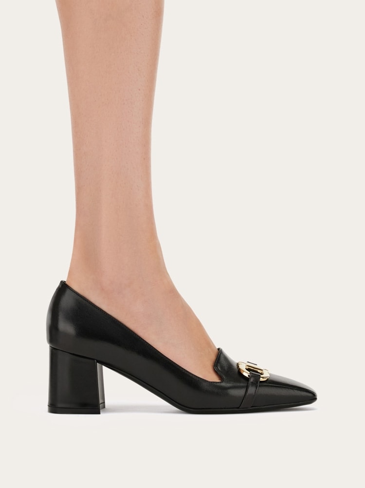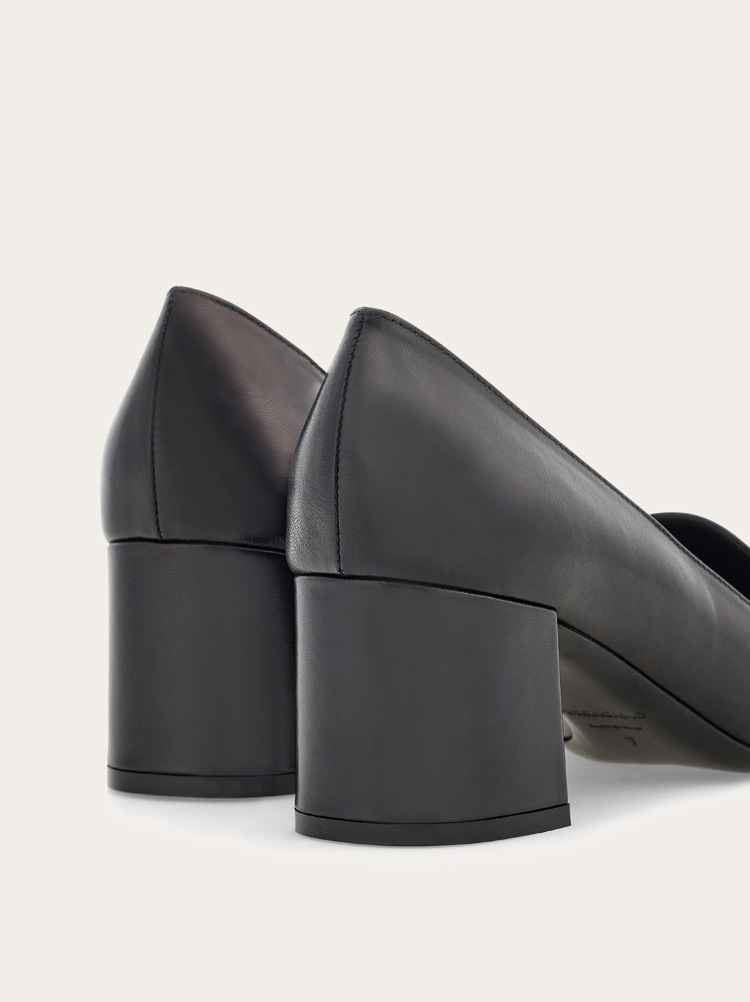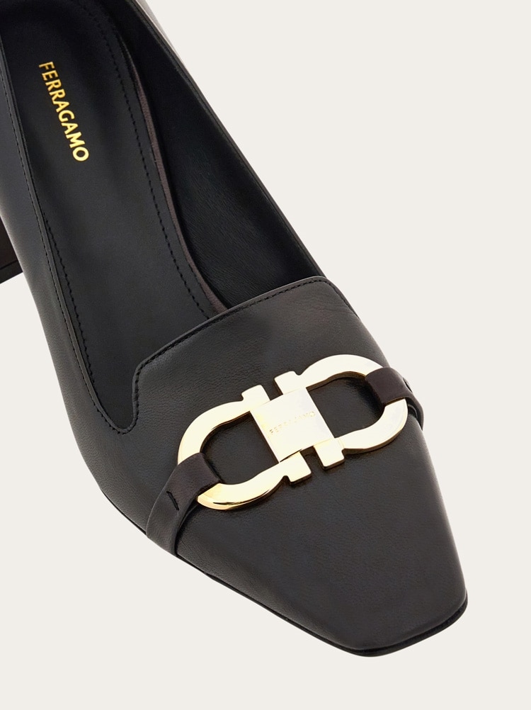 Uptown girl. A new twist on the iconic Ferragamo loafer, the vamp on this block heeled slip on is inspired by the classic silhouette. Made of the finest Italian calfskin, it has a Gancio buckle on the instep, held by a custom square tab in the center. The large covered heel ensures all day comfort for strutting the runway of life.