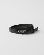 This belt characterized by its sleek, refined design is completed with a metal buckle that recalls the emblematic triangle logo. The design is made of the brand’s iconic Saffiano leather with its distinctive waxed finish and crosshatch texture.